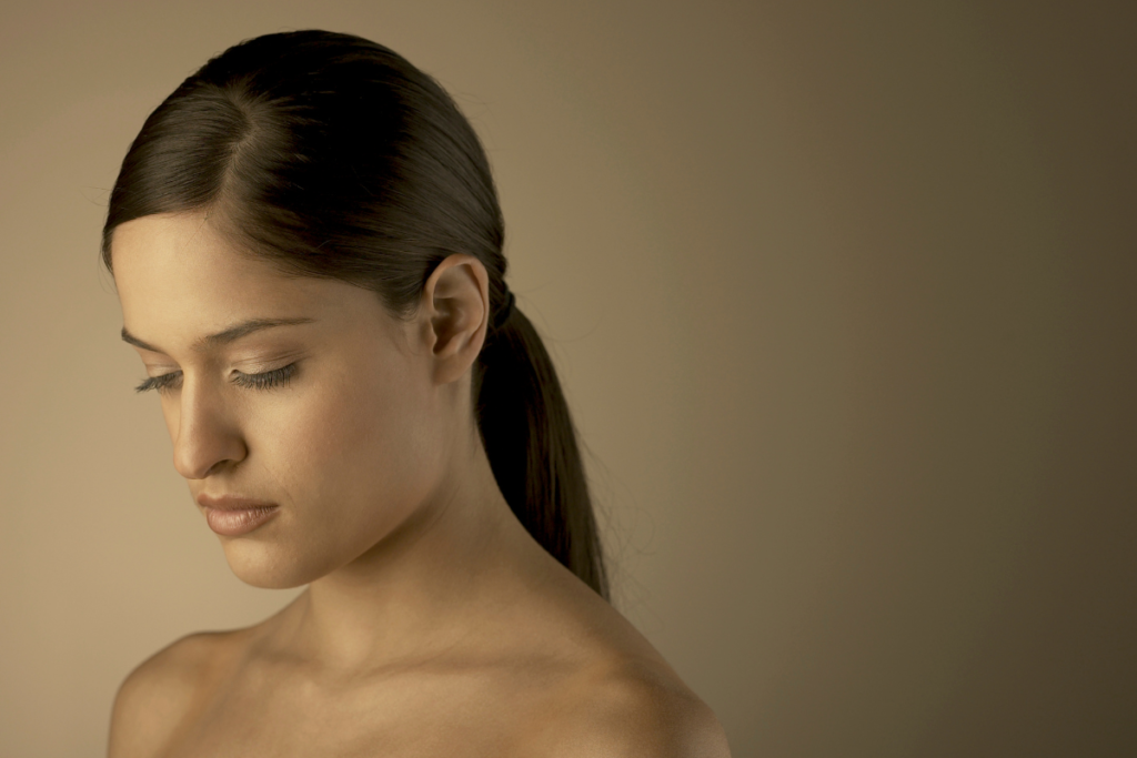 真っ直ぐ座り少し顎を引くように下側に目線を向けます。